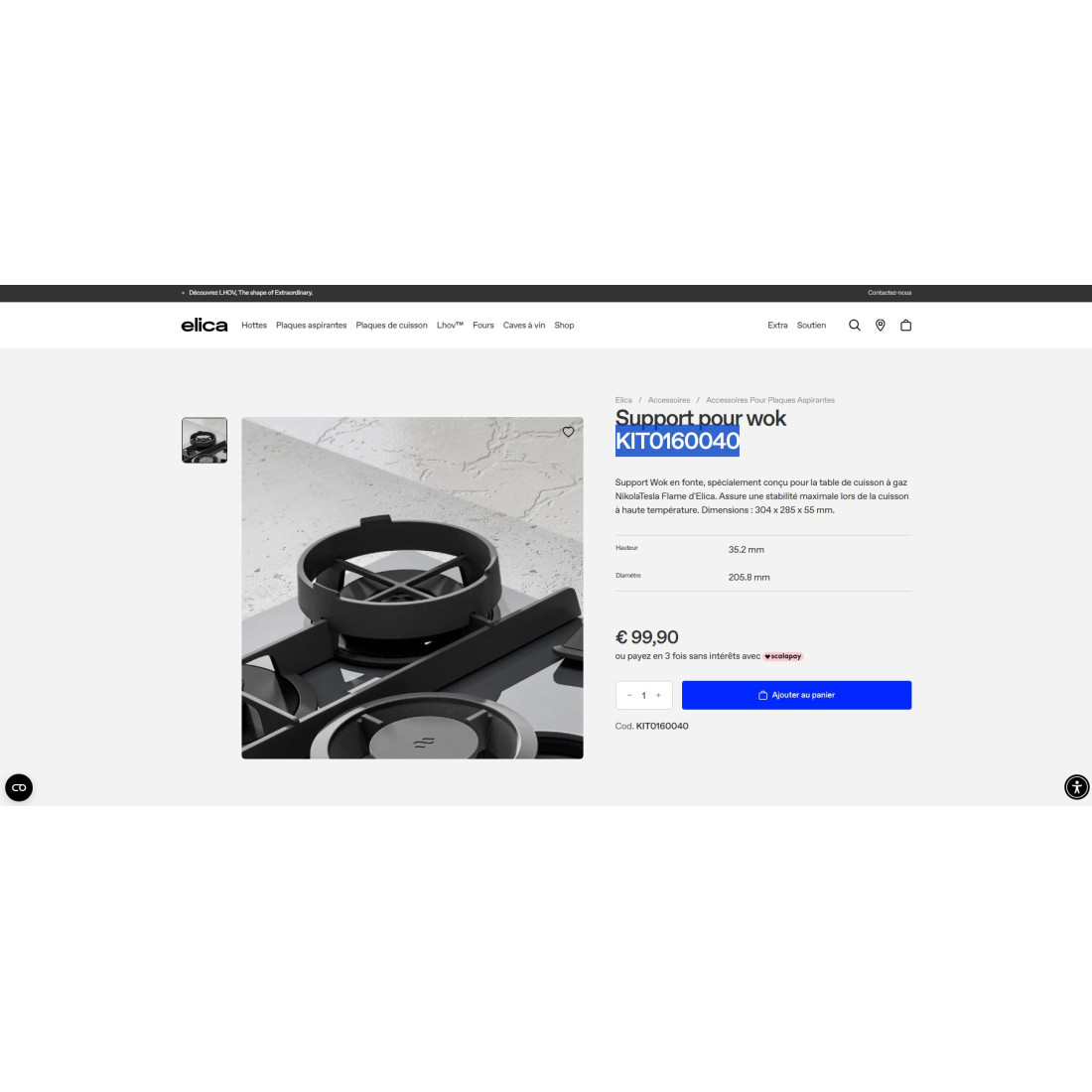 Support Wok en fonte, spécialement conçu pour la table de cuisson à gaz NikolaTesla Flame d'Elica. Assure une stabilité maximale lors de la cuisson à haute température.