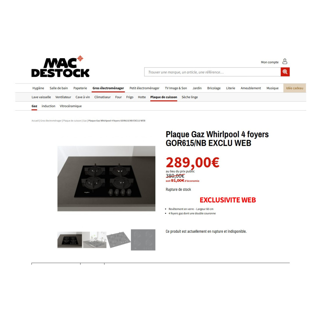 * Type de produit Table de cuisson au gaz - 4 plaques de cuisson